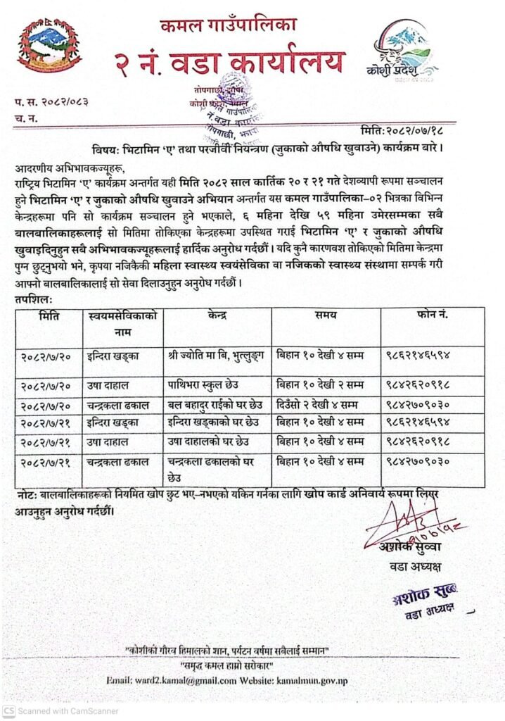 त्यस्तै, भिटामिन ‘ए’ र जुकाको औषधि खुवाउने राष्ट्रिय कार्यक्रम अन्तर्गत भोलि मङ्सिर २० र २१ गते २ नं. वडामा बालबालिकालाई भिटामिन ‘ए’ र जुकाको औषधि वितरण गरिने वडा कार्यलयले जानकारी दिइएको छ।