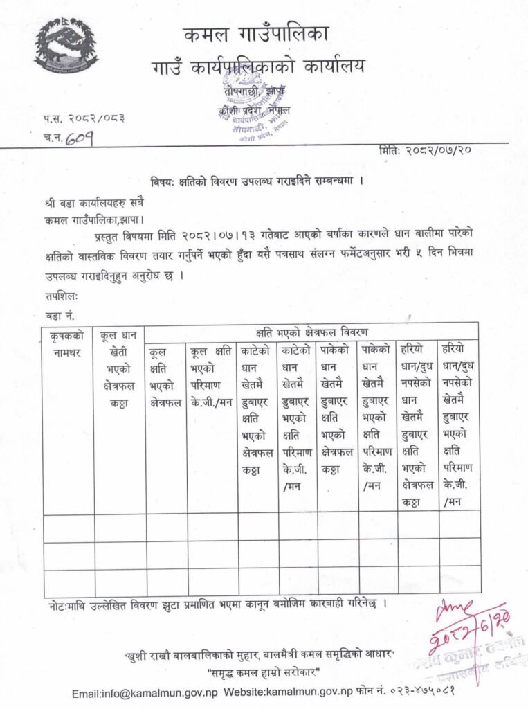 विपद्को अवस्थामा गरिएको सहयोगप्रति गौरादह नगरपालिकाका मेयर छत्रपति सुवेदी र दमक नगरपालिकाकी उप–मेयर रेगिना भट्टराई प्रसाईंले कमल गाउँपालिकाप्रति आभार प्रकट गर्नुभएको छ।