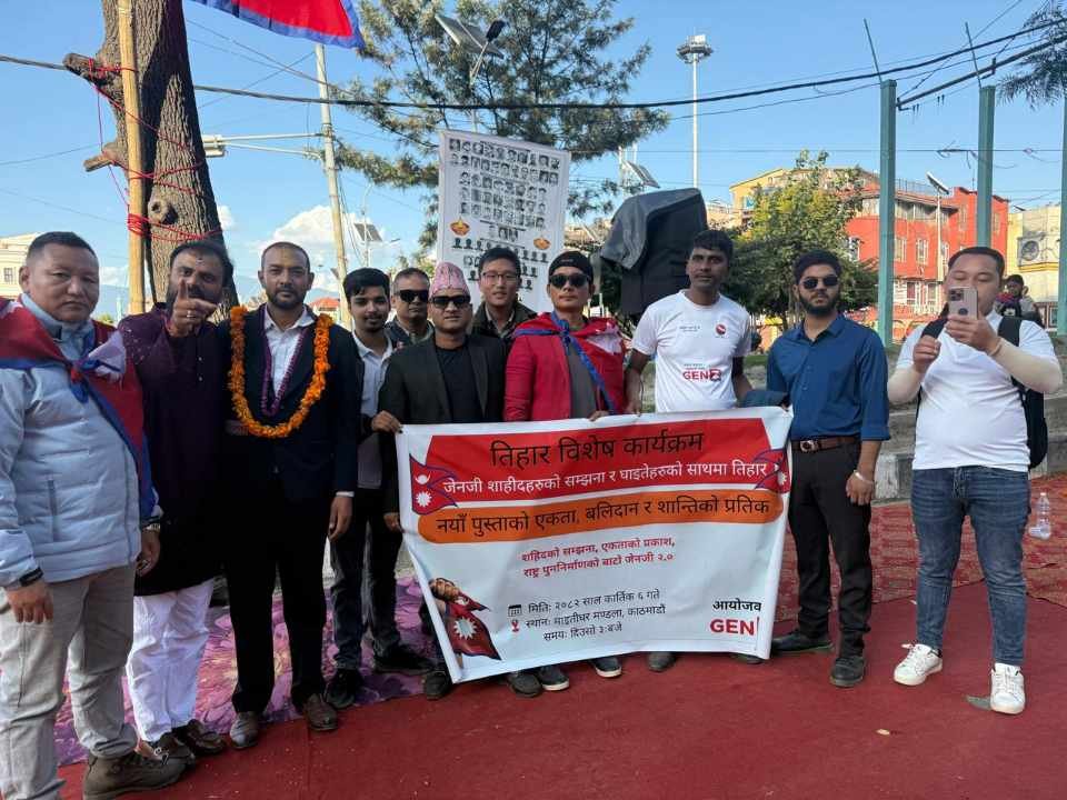 काठमाडौं । तिहारको अवसरमा GenZ 2.0 (सबै पुस्ताको सारथी) राष्ट्रिय अभियानले “जेनजि सहिदहरूको सम्झनामा” शीर्षकमा विशेष श्रद्धाञ्जली कार्यक्रम काठमाडौंको माईतीघर मण्डलामा सम्पन्न गरेको छ।