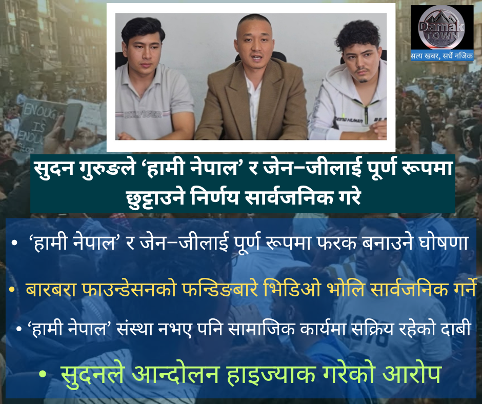 ‘अब देखि हामीले के सोचिराख्या छौं भने जेन–जी र हामी नेपाल पूर्ण रुपमा फरक बनाउने भन्ने हाम्रो सोचाइ छ,’ सुदनले भने। हामी नेपाल एउटा संस्था नभएको बताउँदै उनले यसबाट बेलाबेला धेरै राम्रा काम गरेको दाबी गरे।