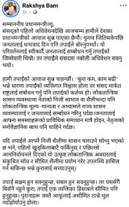 काठमाडौँ — जेन–जी अभियन्ता रक्षा बमले सम्माननीय प्रधानमन्त्रीलाई लक्षित गर्दै संसद्को पहिलो अधिवेशनदेखि हालसम्म प्रधानमन्त्रीको स्पष्ट सम्बोधन नआएकोप्रति प्रश्न उठाएकी छन्।